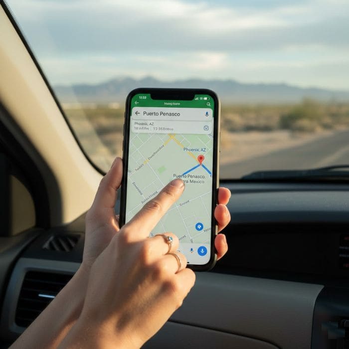 Amanda started searching on Google while I drove, scanning maps and reviews. From where we were, Puerto Peñasco (Rocky Point), Mexico showed up as a realistic option rather than a distant plan.