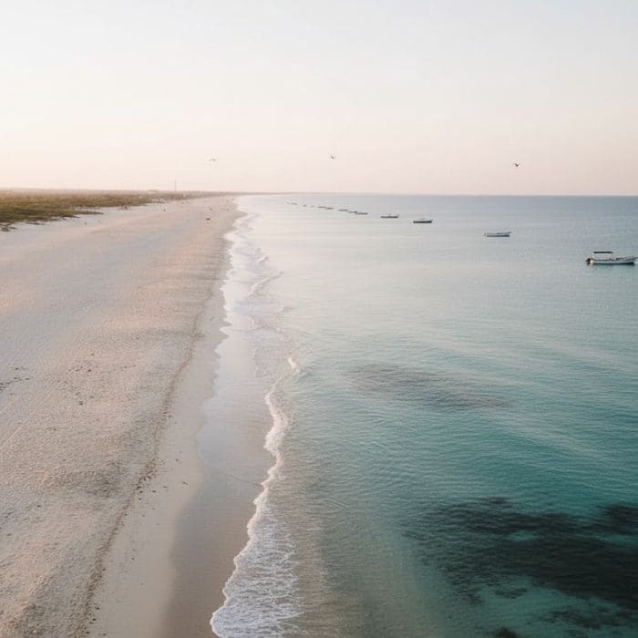 The sand was light in color and fine underfoot, cool in the morning and warming steadily as the sun climbed. The shoreline was wide enough that even when a few other people were scattered along it, there was still a strong sense of space. The water was calmer than expected, with shallow waves rolling in quietly and clear patches near the shore where you could see movement beneath the surface.