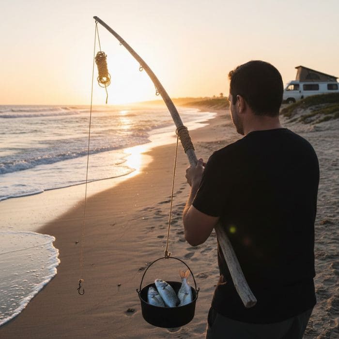 We made a handmade fishing rod from basic materials: a straight piece of wood we found near the beach, a length of string we had packed in the van, and a small hook we’d brought along just in case. It wasn’t pretty, and it wasn’t precise, but it was functional.