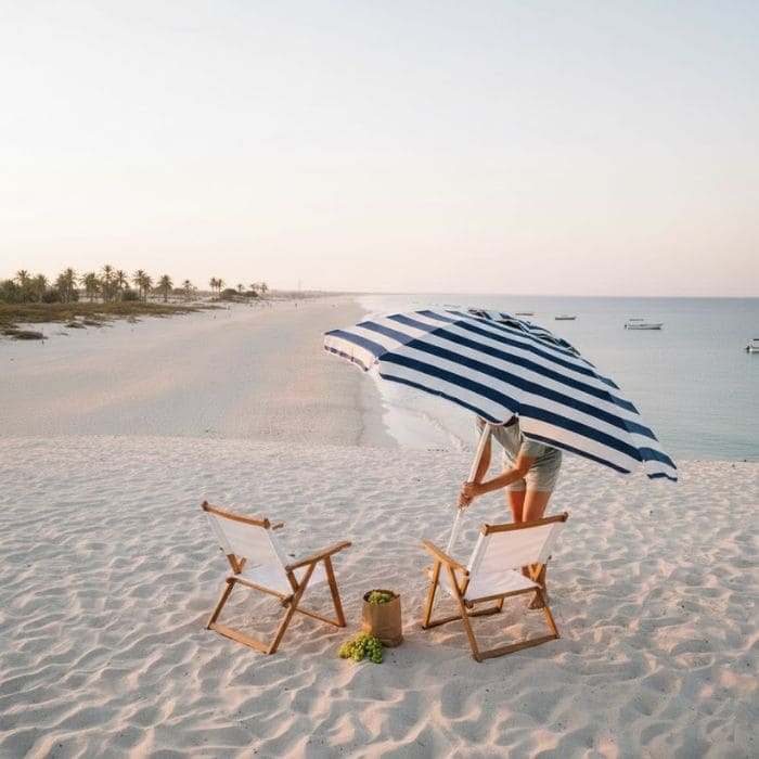 We didn’t bring much onto the beach, and that turned out to be perfect. We set up an umbrella for shade and placed two small folding chairs facing the water, far enough back to avoid the tide but close enough to hear the waves clearly.