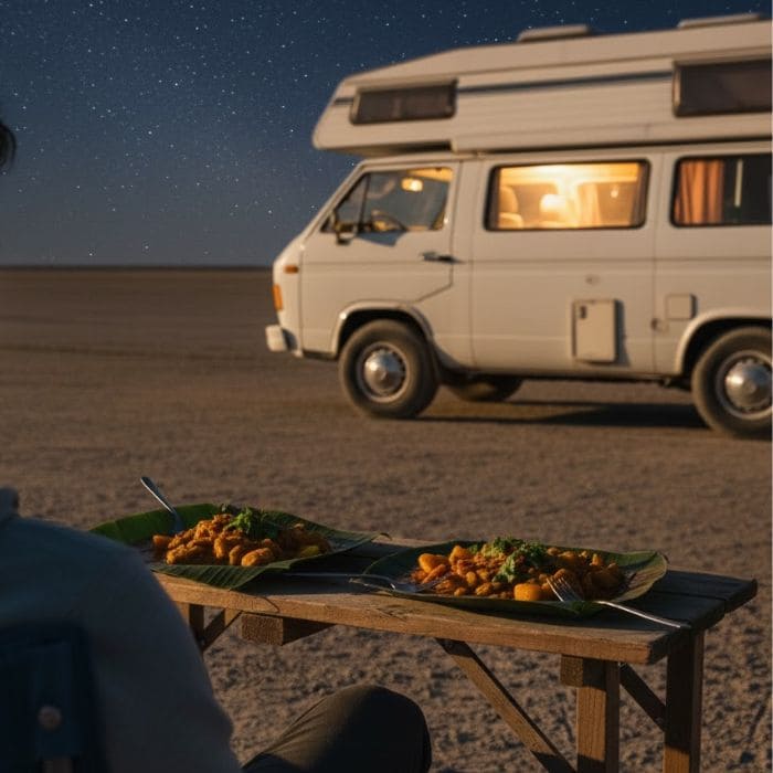 We sat at the tiny table, and for a second the meal felt almost ceremonial, even though it was just two tired adults eating curry in a van.