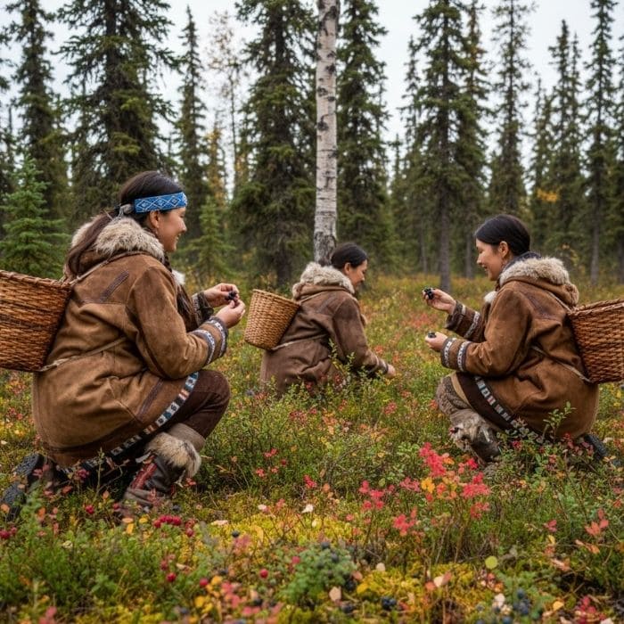 They pointed out berries that are commonly gathered in Alaska, like blueberries, lingonberries (often called lowbush cranberries), and crowberries, and Amanda loved crowberries in particular because they looked simple and dark against the tundra-like ground cover, almost understated until you realize how common and useful they are in Alaska’s berry culture.