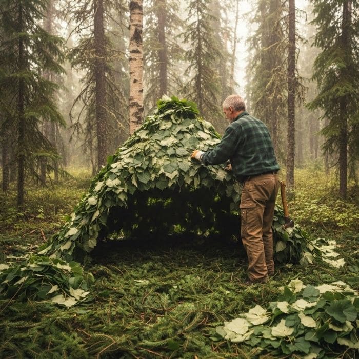 He used spruce boughs first, the kind with dense needles that naturally create insulation and a soft, springy base, and then he layered broad leaves over the top, mostly birch leaves and cottonwood leaves, because they were everywhere in that area and they overlapped beautifully like shingles when placed the right way.