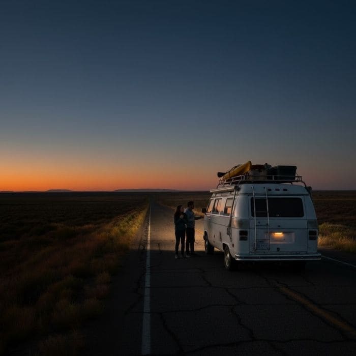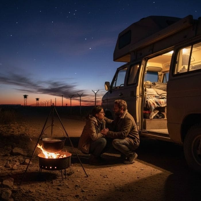 There was no electricity outside our van, no artificial light cutting through the darkness, only the slow fading of the sky and the wind moving across open land, and that kind of darkness doesn’t feel empty, it feels watchful, because your senses start filling in gaps whether you want them to or not.