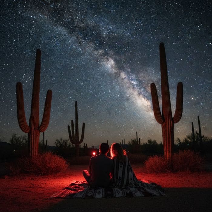 The sky felt huge. Not poetic huge. Actual huge, the kind that makes your problems look smaller without you trying. We didn’t have a telescope, just our eyes, a blanket, and the desert around us, with saguaros and organ pipes standing in silhouette like they were watching too.