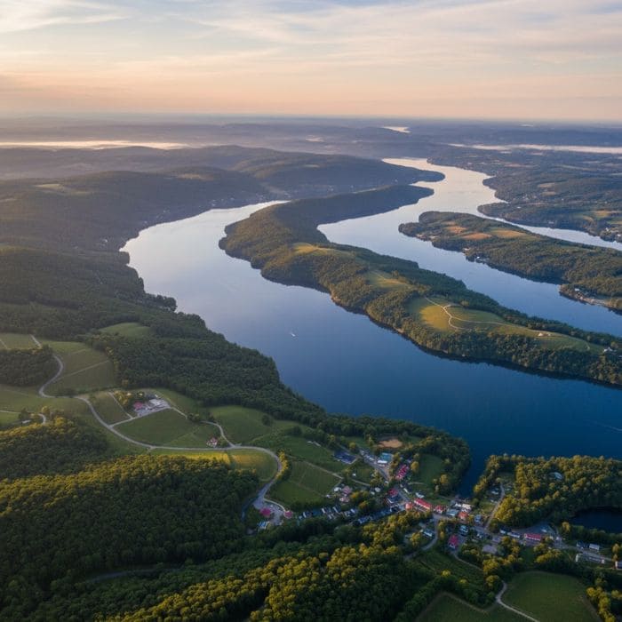You start noticing details you’d never catch from the road, thin roads connecting tiny towns, boat wakes like white stitches across the surface, clusters of trees hugging the edges of fields.